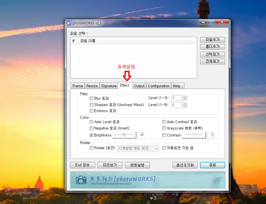 포토웍스 사진용량 줄이기에서는 여러 가지 간단한 효과들을 줄 수가 있는데요. 부드럽게, 날카롭게 등 여러 효과들이 있지만, 개인적으로는 사용하지 않네요. 필요하신 분들은 간단하니 또 나름 유용한 기능이지 않을까 싶습니다.
